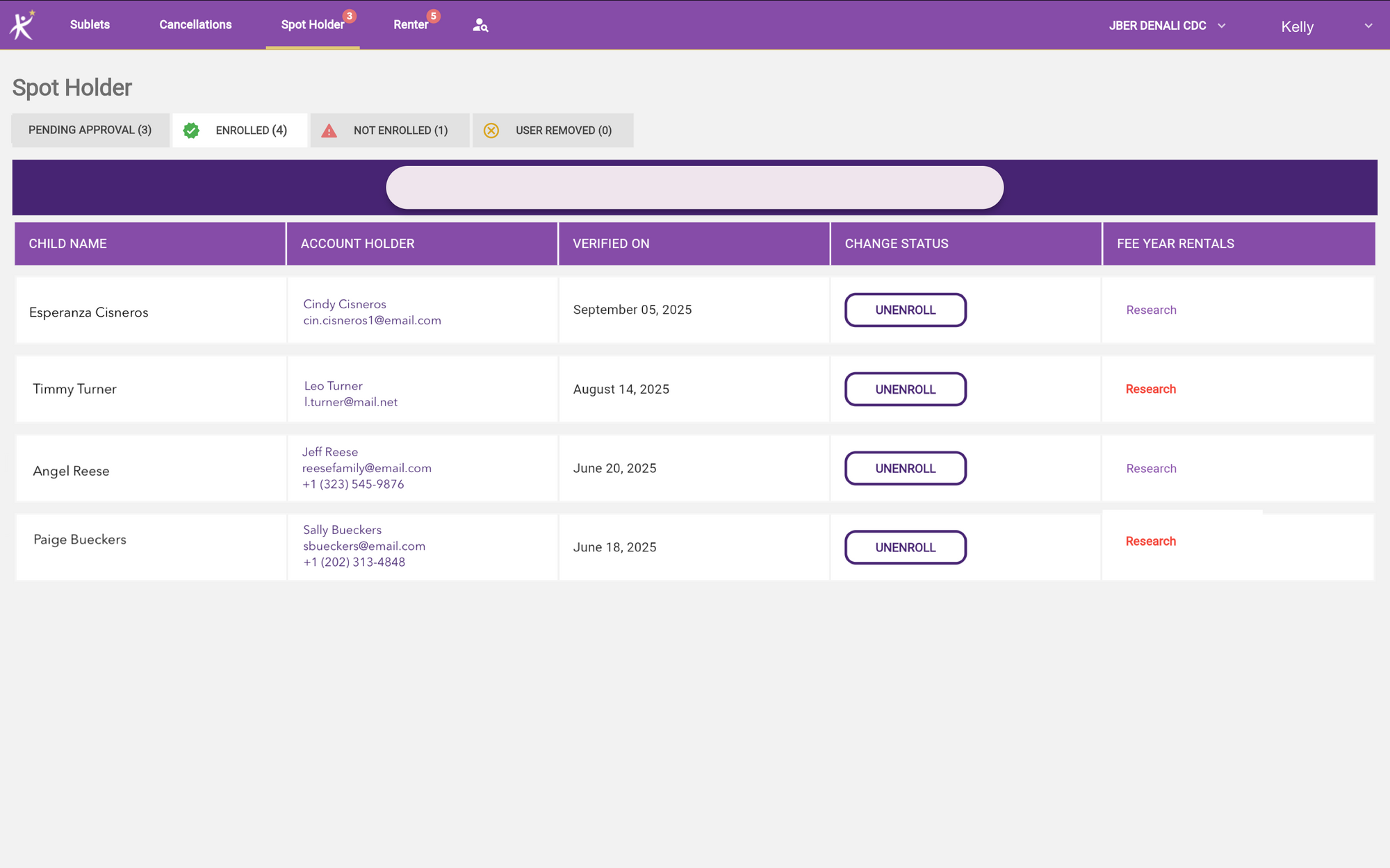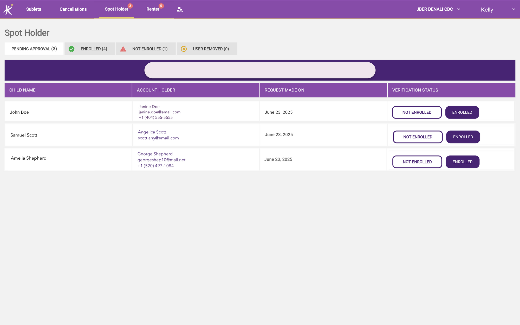 By selecting Spot Holder, you will be brought to the page where pending spot holder verifications sit until enrolled, or not enrolled, as well as a comprehensive list of all enrolled and unenrolled children.